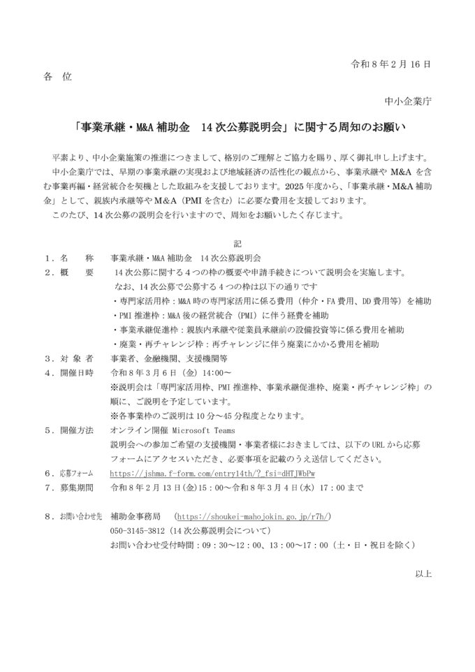このたび、14次公募の説明会を開催いたしますので、下記内容をご確認下さい。